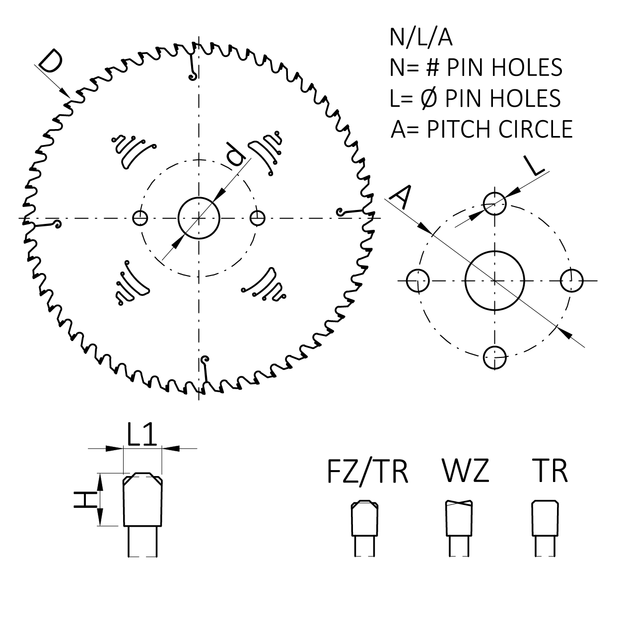 Zahnform FZ/TR, WZ oder TR, positiv. Optimale Schnittqualität bei allen Holzwerkstoffen und anderen Materialen. Korpus mit Laserornamenten zur Lärmminderung. Andere Zahnformen möglich auf Anfrage.